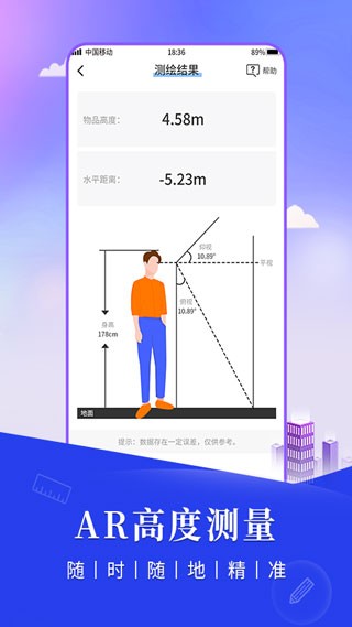 1、高度测算:用户仅需录入个人身高数据作为基准,随后对准目标物的下端与上端拍摄标记点,即刻高效获取物体的竖直尺寸。不仅如此,该功能还涵盖了水平间距、垂直尺度和倾斜距离等多重测量方案,轻松应对多样环境的需求。