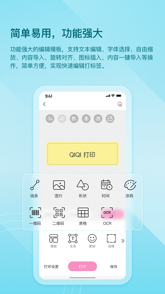 包括文本、图片、图标、涂鸦、边框、条形码、二维码、时间、形状、线条、OCR等,编辑过程更自由。