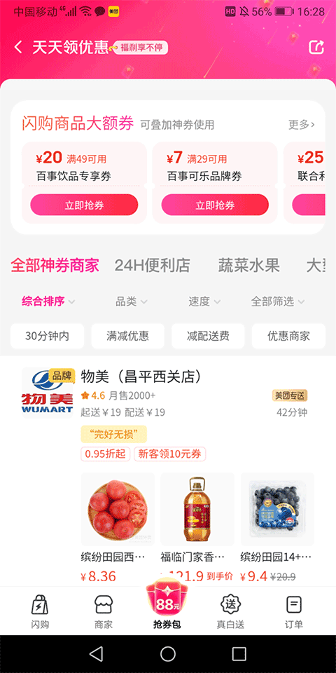 4、另外美团闪购平台还会每天向消费者推荐好多大额优惠券。