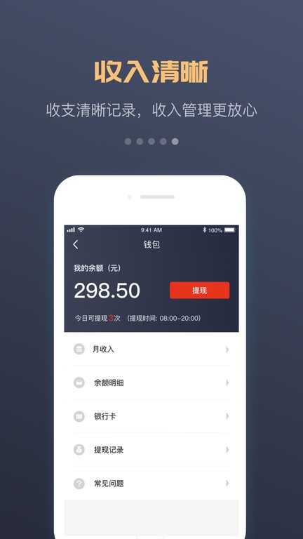 收益清晰透明:自动生成账单明细,每周可提现,收益即时到账,账目清晰明了,让司机收入一目了然。