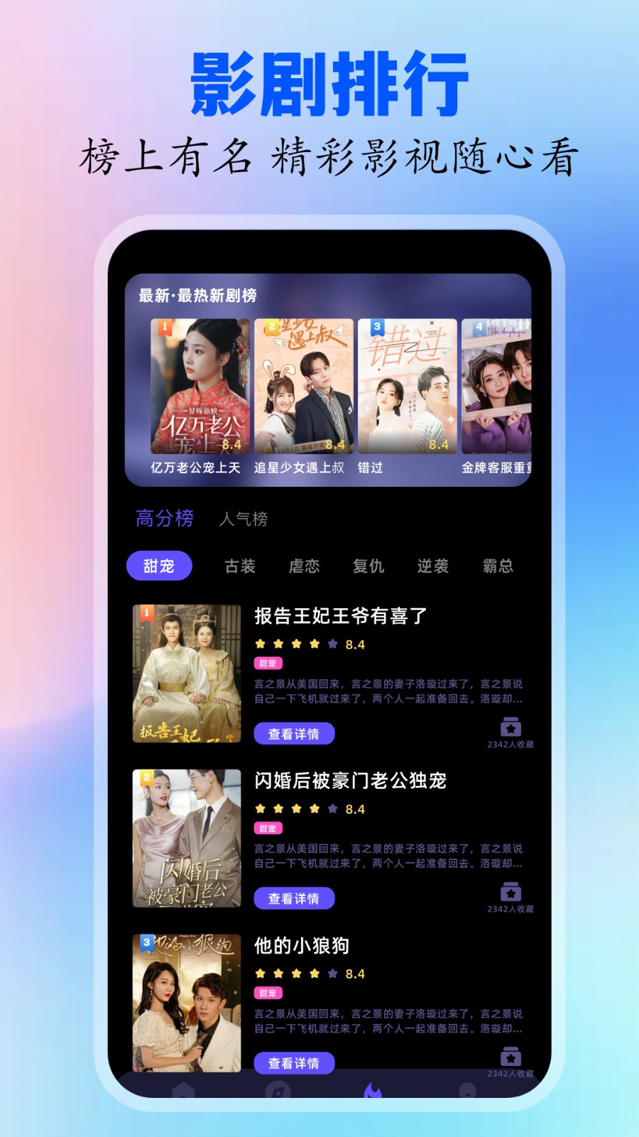 新影视大全app为大家带来了全网各种影视资源,能够根据自己的需求进行搜索,分类筛选任意的剧都很方便的,完全没有任何的看剧限制了。平台上的剧画质非常高,每次都能极速的进行加载,及时收藏自己爱看的剧了。