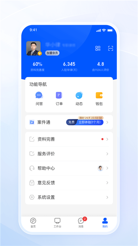 5、在线接单:律师可通过App快速获取案源,开启接单服务,获取快问订单,高效链接用户需求。