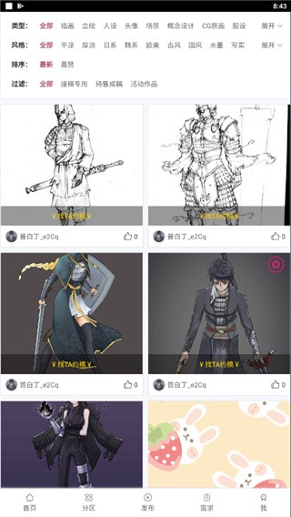 5、在软件的需求栏,你可以查看不同类型的插画约稿,也可以发布不同类型的漫画招聘。