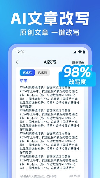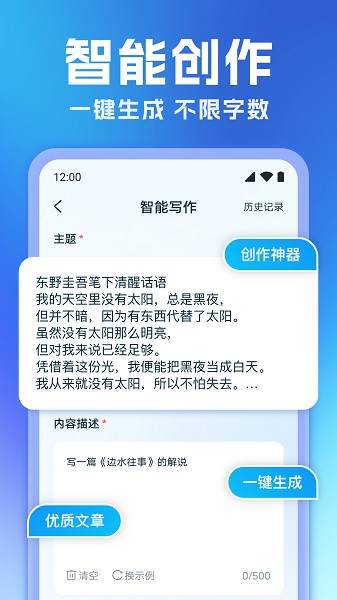 2、一键生成,通过AI技术,用户只需简单操作即可一键生成高质量的文本,大幅提升写作效率。