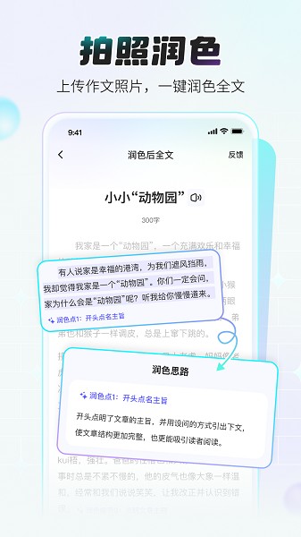 2、AI引擎能够精准识别作文中的各类问题,并给出针对性建议,使批改过程更加客观、高效,同时节省了家长和老师的时间成本。