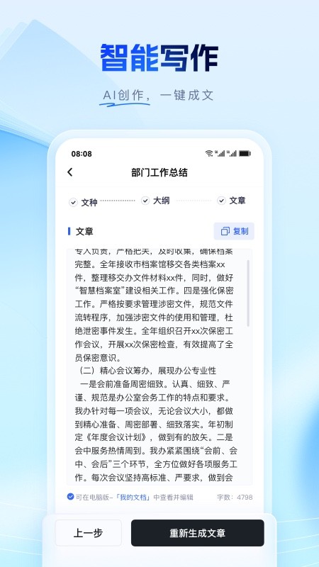 1、提供多种写作场景适配内容,包括但不限于述职报告、会议纪要、教学计划、课程论文等,全面覆盖用户日常工作与学习中的写作难题。