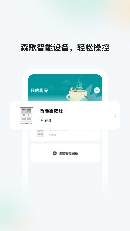 1、森歌智能旗下专为打造智慧厨房生活而设计的智能管理平台,作为连接旗下所有智能厨电产品的统一入口,助力用户实现厨房设备的一体化智能控制。