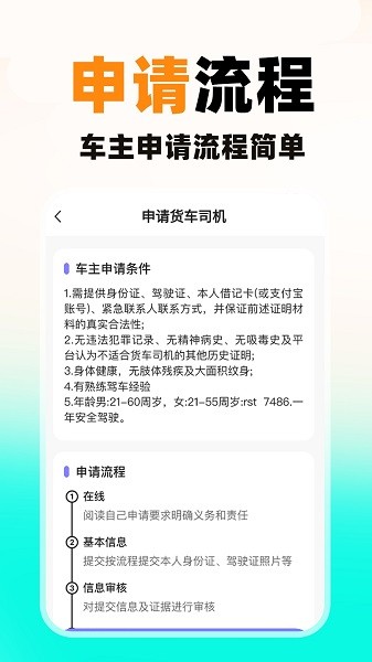 1、专为货运行业打造的智能出行助手,集货车司机注册、接单管理、安全提示、货运知识于一体,为司机和发货方提供便捷的货运服务。