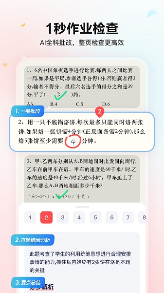 为你提供全面而高效的作业与试卷批改服务,实现整页批改以及错题精准收录,每道题都配套了精准的错因分析,更有AI分步骤的原题讲解,支持随时追问,哪里不懂问哪里,都可以即时得到解答,全方位满足你个性化答疑解惑的需求,助力你在学习道路上稳步前行。