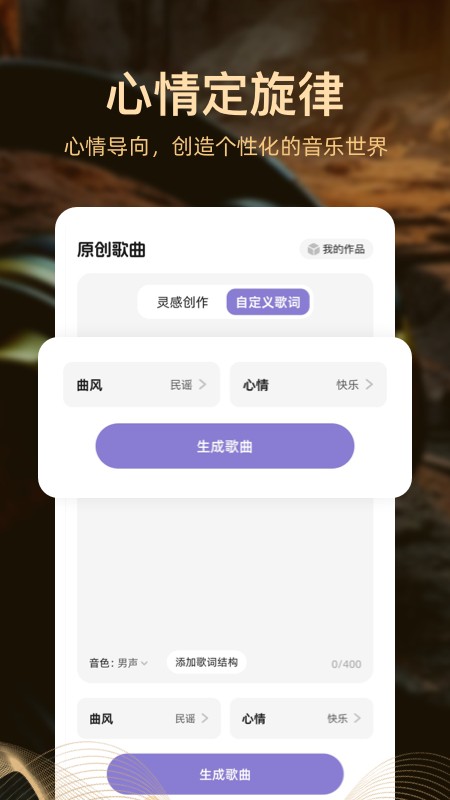 1、搭载先进的AI生成算法,能够根据用户输入的关键词、情绪或风格偏好,自动生成风格多样、旋律动人的音乐作品。