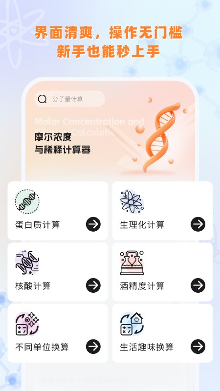 2、软件集成了多种科学计算功能,包括但不限于蛋白质、生理化学参数、核酸以及酒精浓度的计算,是实验室工作中的得力助手。