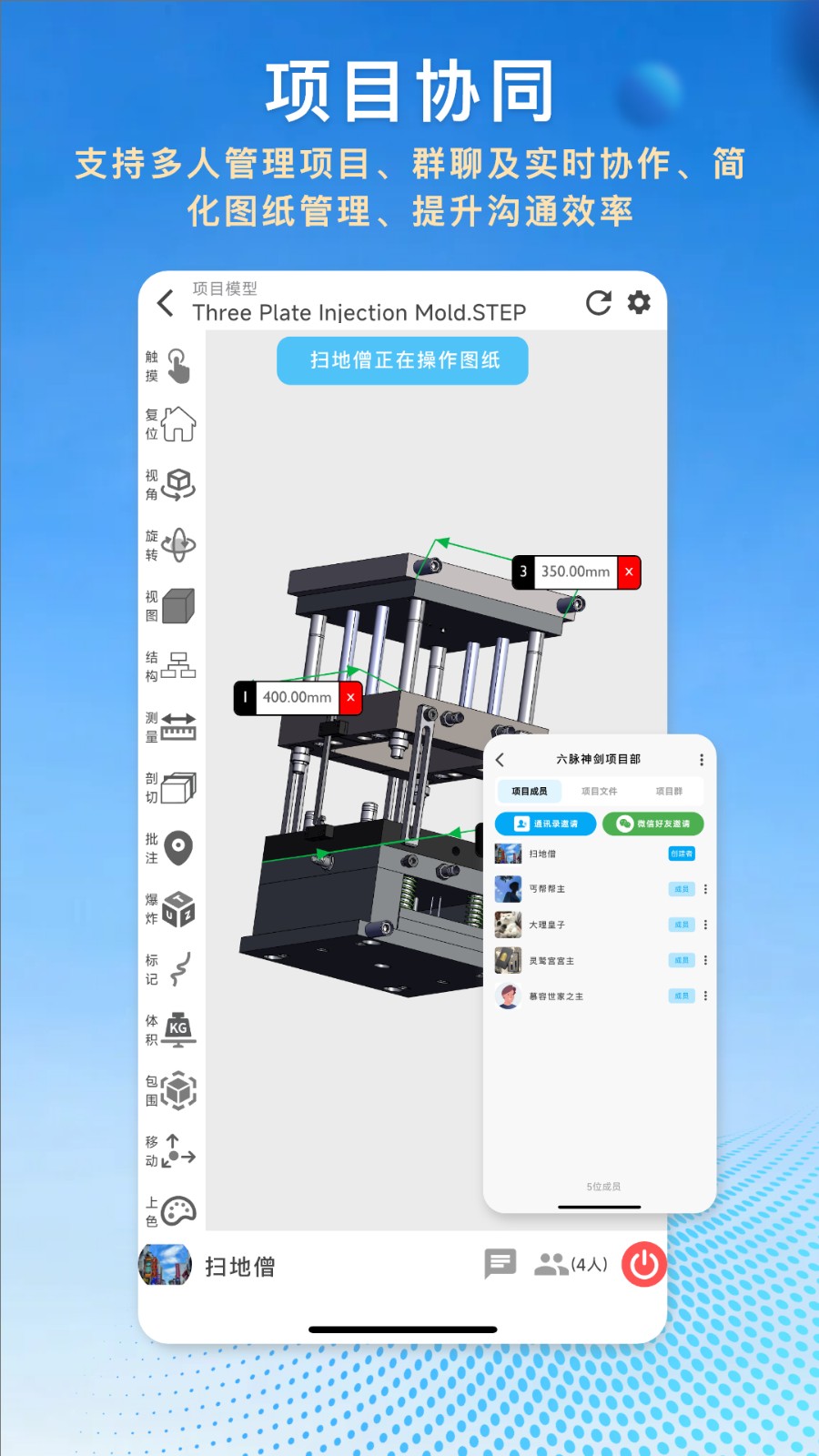用户可以通过创建项目邀请他人加入,实现多人实时协作编辑图纸,群聊功能可以帮助团队成员间保持高效沟通,同时还能进行远程评审和多方协同会议。