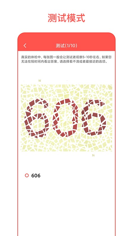 3、 界面简洁无干扰,专注于色觉测试本身,减少外界视觉干扰因素,让用户在接近真实体检环境的条件下进行自我评估,提升测试结果的参考价值。