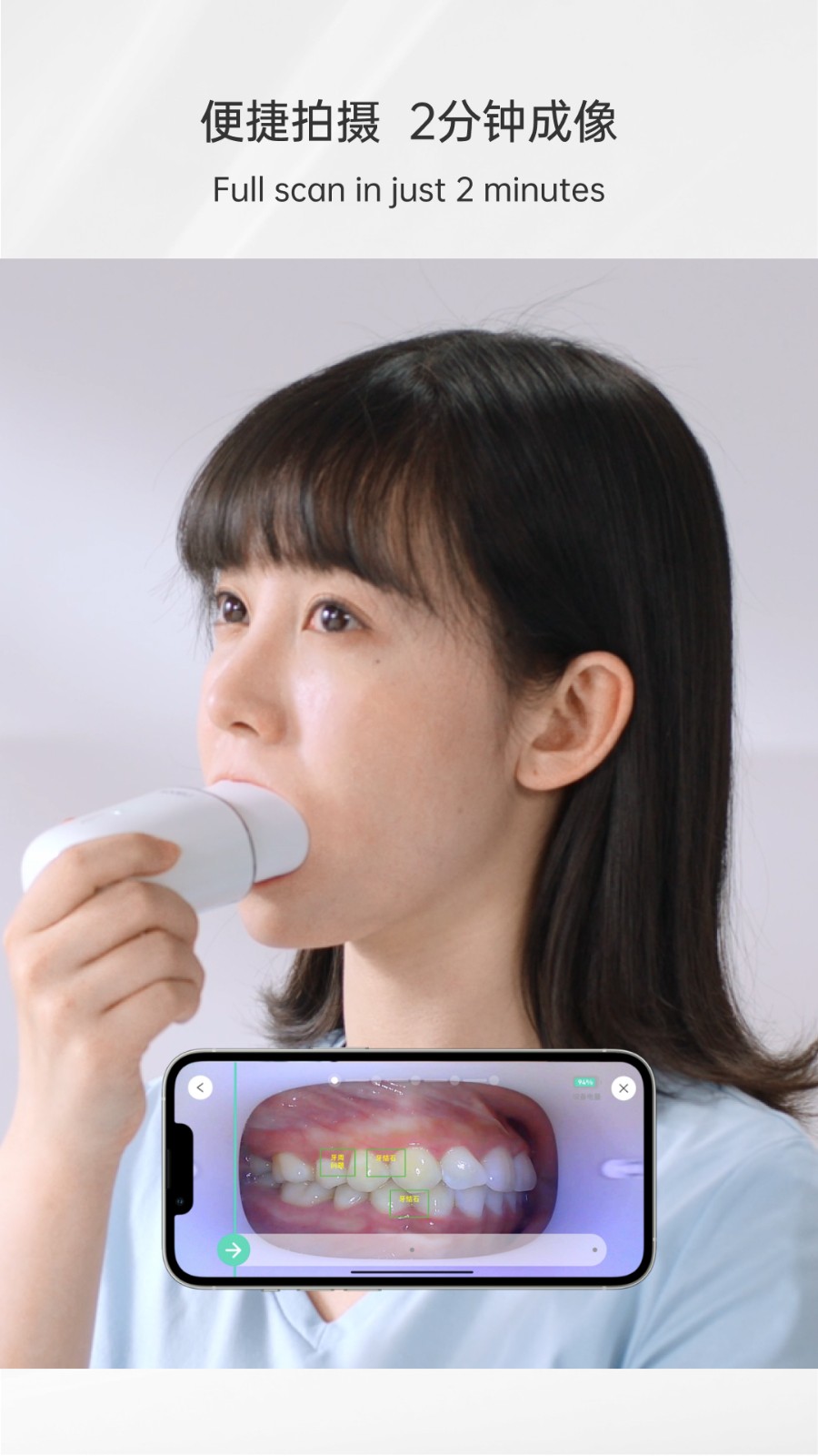 3、使用便携扫描仪在2分钟内完成口腔全面扫描,快速成像高效直观查看牙齿健康状况。