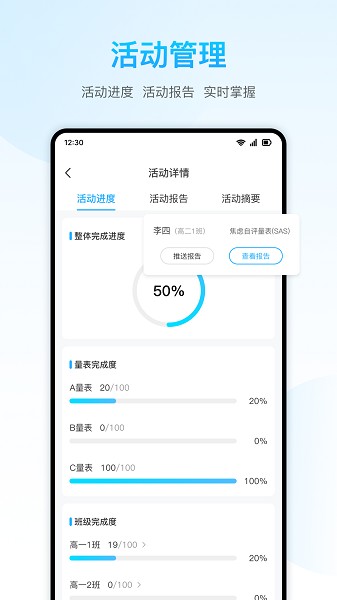 3、教育局端可实时查看辖区内各学校的测评覆盖率、异常率、咨询响应情况等关键指标,支持跨校数据对比分析,并可根据区域需要统一发起大规模心理普查或专项评估活动,强化统筹管理能力。