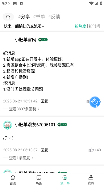 设有“漫广场”板块,这是一个供用户交流心得、讨论剧情以及结交同好的地方。