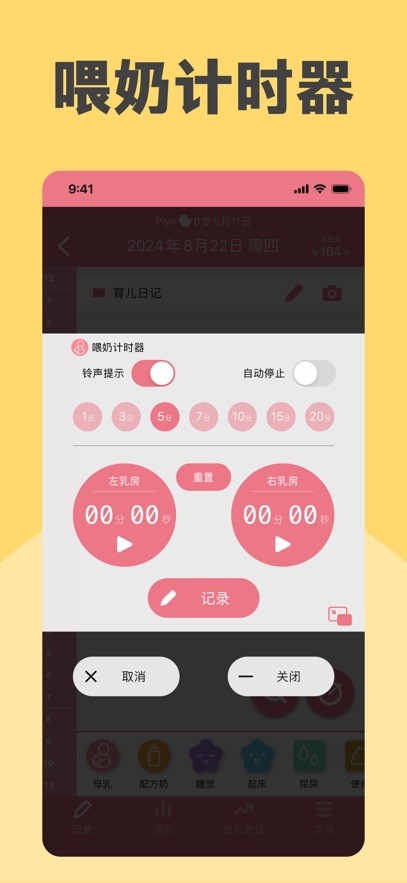 定制提醒:设定定时提醒以帮助记住重要的护理任务,例如下一次哺乳的时间 。