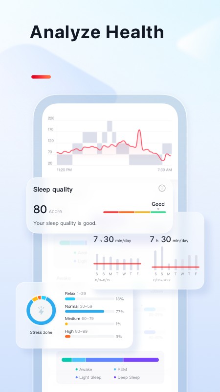 3、支持全天候睡眠监测功能,能够自动识别入睡与清醒时间,分析深睡、浅睡及清醒周期,生成详细的睡眠质量报告,助力改善作息习惯。