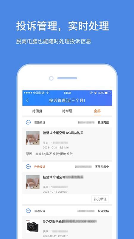 3、针对订单投诉提供专项处理通道,商家可第一时间接收到投诉通知并在线响应,有效降低纠纷升级风险,维护店铺信誉与评分。