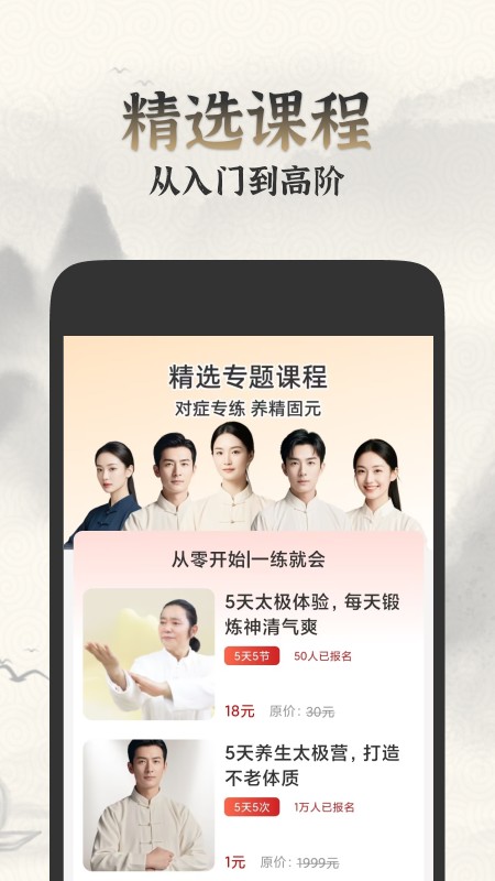1、界面设计古朴典雅,融合中国传统文化元素,营造静心宁神的学习氛围,让用户打开应用即进入太极心境,怎么查看课程都行。