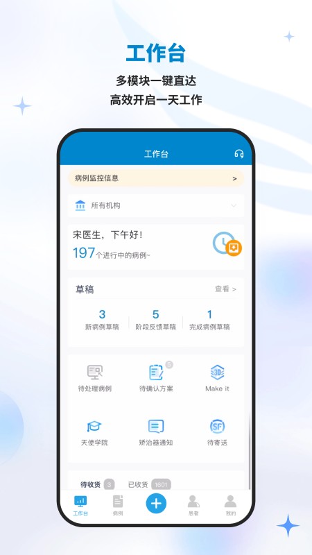 医生可以随时随地跟踪病例进展,无需电脑即可便捷查看与管理患者病例信息,轻松掌控治疗过程。这包括病例提交、设计及修改、病例加和病例智能管理等。