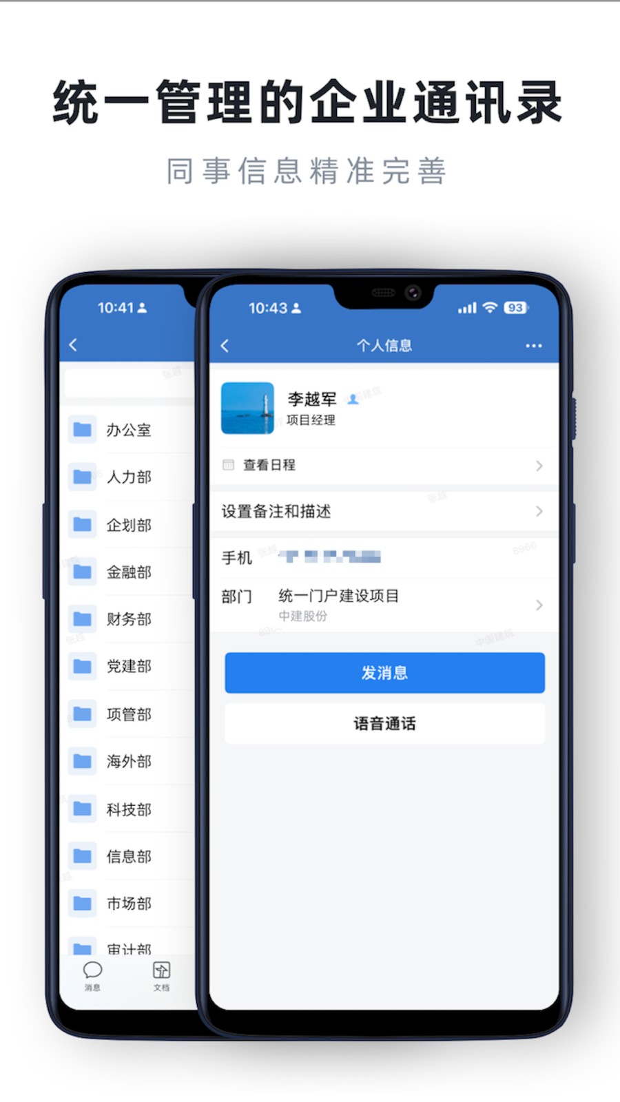 1、内置完整的企业级通讯录与清晰的组织架构图,支持按部门、项目、岗位快速查找联系人,方便各级员工高效沟通与协作。