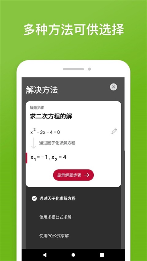2、扫描数学题后,结果会出现在屏幕底部。轻按“显示解决步骤”按钮以查看单个更详细的步骤。