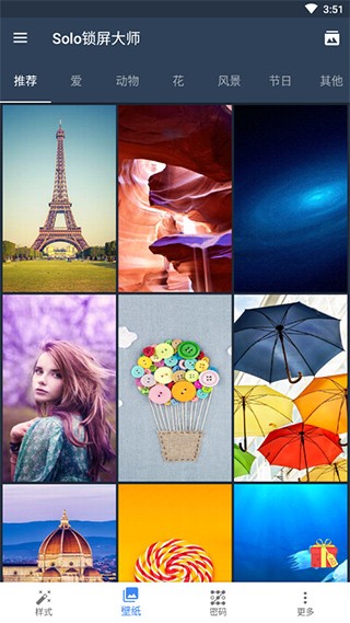 Solo锁屏大师是个专业的手机锁屏应用软件,为用户提供了专业的动态唯美的个性场景及锁屏主题,超多的主题样式可以选择,定制出不同的手机锁屏界面,灵活的照片锁屏、九图锁屏、九宫格锁屏、自定义锁屏,用户可以自由的设置。