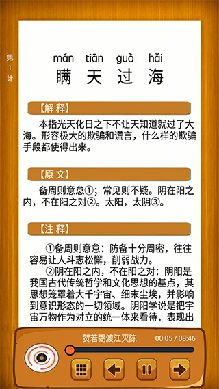 一款通过听故事学习中华传统文化的软件,尤其适合儿童使用。收录中国古代三十六个兵法策略,如《瞒天过海》《围魏救赵》等,每个计策均提供原文、解释和注释,帮助用户深入理解其含义。