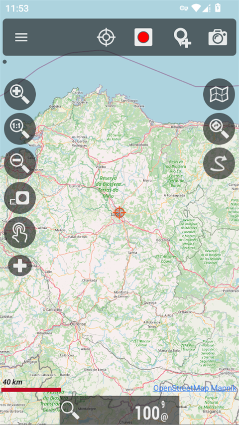 上图便是Oruxmaps的基本界面,其中使用较多的功能:定位开关、记录开关、手势开关、测量工具,以及菜单中的航迹、路径、地图。