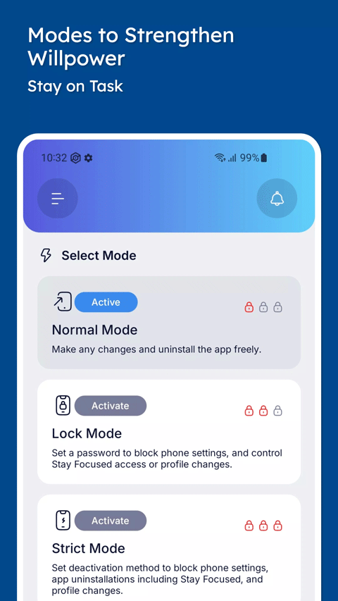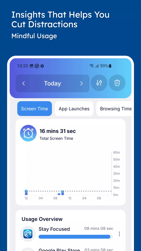 Stay Focused是一款屏幕使用管理限制类型的应用软件,主要设定计时器、屏幕监控以及提醒功能等等,帮助用户屏蔽与网页屏蔽工具,让你的手机使用更多的控制权,根据自定义条件组织相关的程序,限制手机的整体使用,有需要的用户快来下载吧。