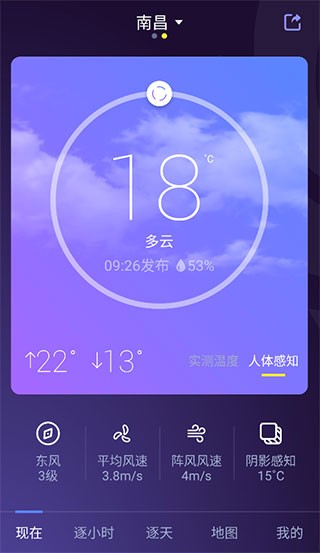 3、选好城市就可以查到当前城市的天气了,风速、体感、能见度、云量都可以很清晰的看到;