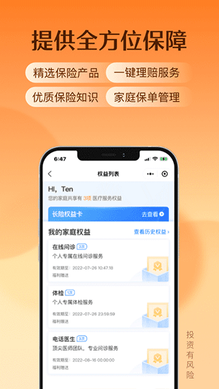 2、医疗、重疾、意外、寿险、年金等人身健康险各类险种,满足不同用户的保障需求。