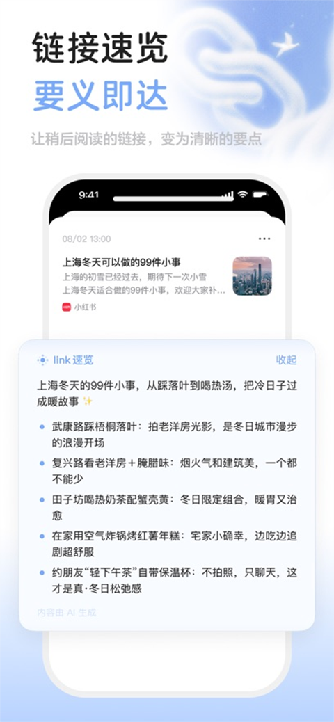 1、自动生成内容速览和一句话总结,帮助用户快速了解链接内容