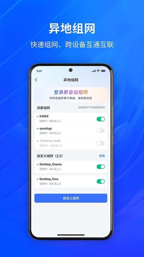 登录后自动绑定当前设备,分配专属组网 IP(如 100.66.x.x)