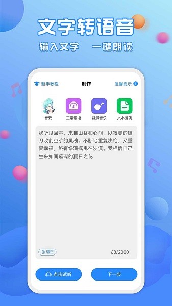 1、线上可以进行实时的文字转语音,选择喜欢的声音快速的进行转换。