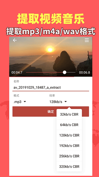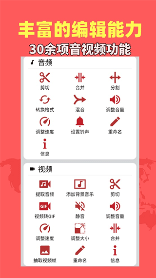 从视频中提取音频MP3,音频格式可以互相转换。可提供调整音量、音频剪切、拼接、裁剪、混合、变速、重命名以及设置铃声等功能。