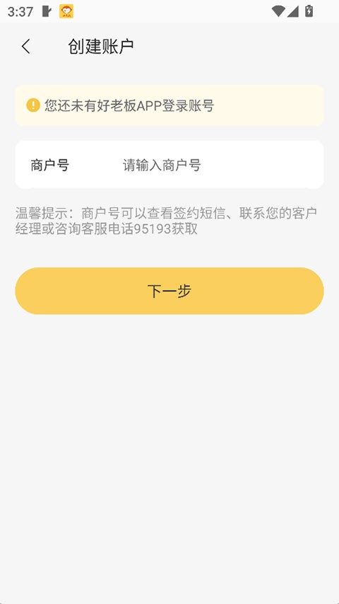 2、然后在APP登录界面点击「首次登录」,在下一个界面中输入商户号与验证码便可进行用户创建(这里的用户是管理员账号)。