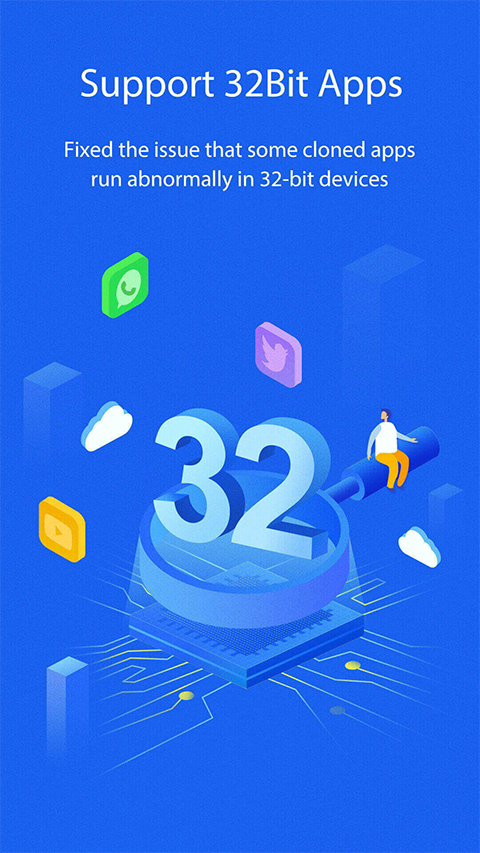 在同一台设备上运行两个相同或不同的32位应用程序实例,多账号登录或多任务处理。