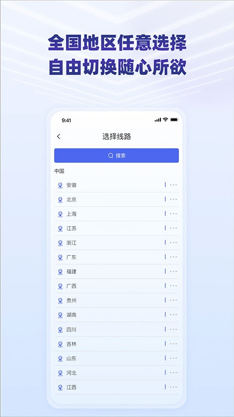 1、app注册登录后选择线路,支持按省份浏览或搜索关键词快速定位节点,操作方式如下: