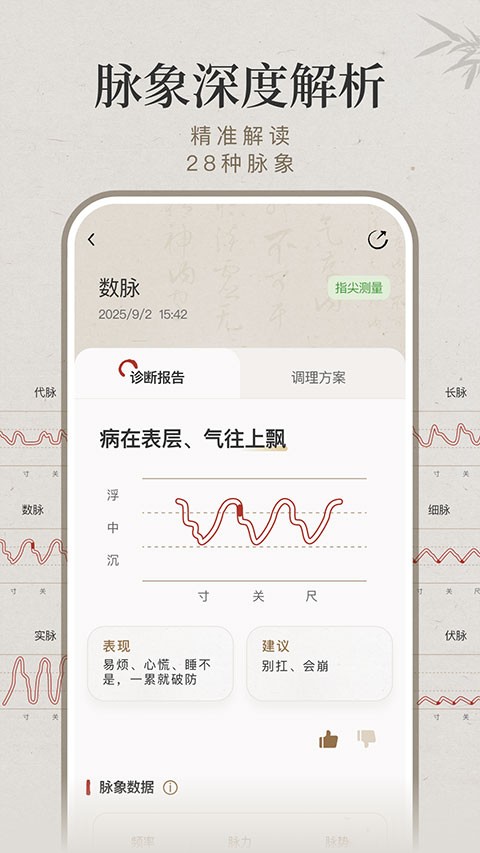 指尖测量和手表测量两种方式,随时了解当日测量的脉象。采用了ai算法,准确识别弦脉、滑脉、细脉等28种常见脉象,通过脉位等多维度参数分析,直观呈现身体状况。
