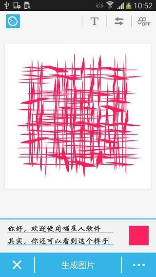 喵星人是一款娱乐性质的文字图片生成器软件,当你想对另一个人说什么话,就可以将语句藏在这个软件里面,给他发一张图,当另一个人拆开这个图才能看到你想说的话,这个举动是不是很浪漫呢,从正文图片看上去是一个鬼画符,从不同的角度欣赏会看到不同的效果。