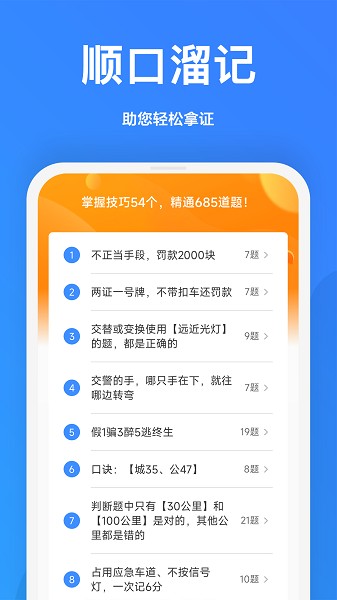 驾考顺口溜app为大家带来了非常丰富的驾考题库资源,无论怎么练习都是支持的,根据自己要考的科目来制定计划,每天都可以随时随地进行刷题了,不断提升自己的成绩,这里也可以进行模拟考试,能够提前适应考试的场景。
