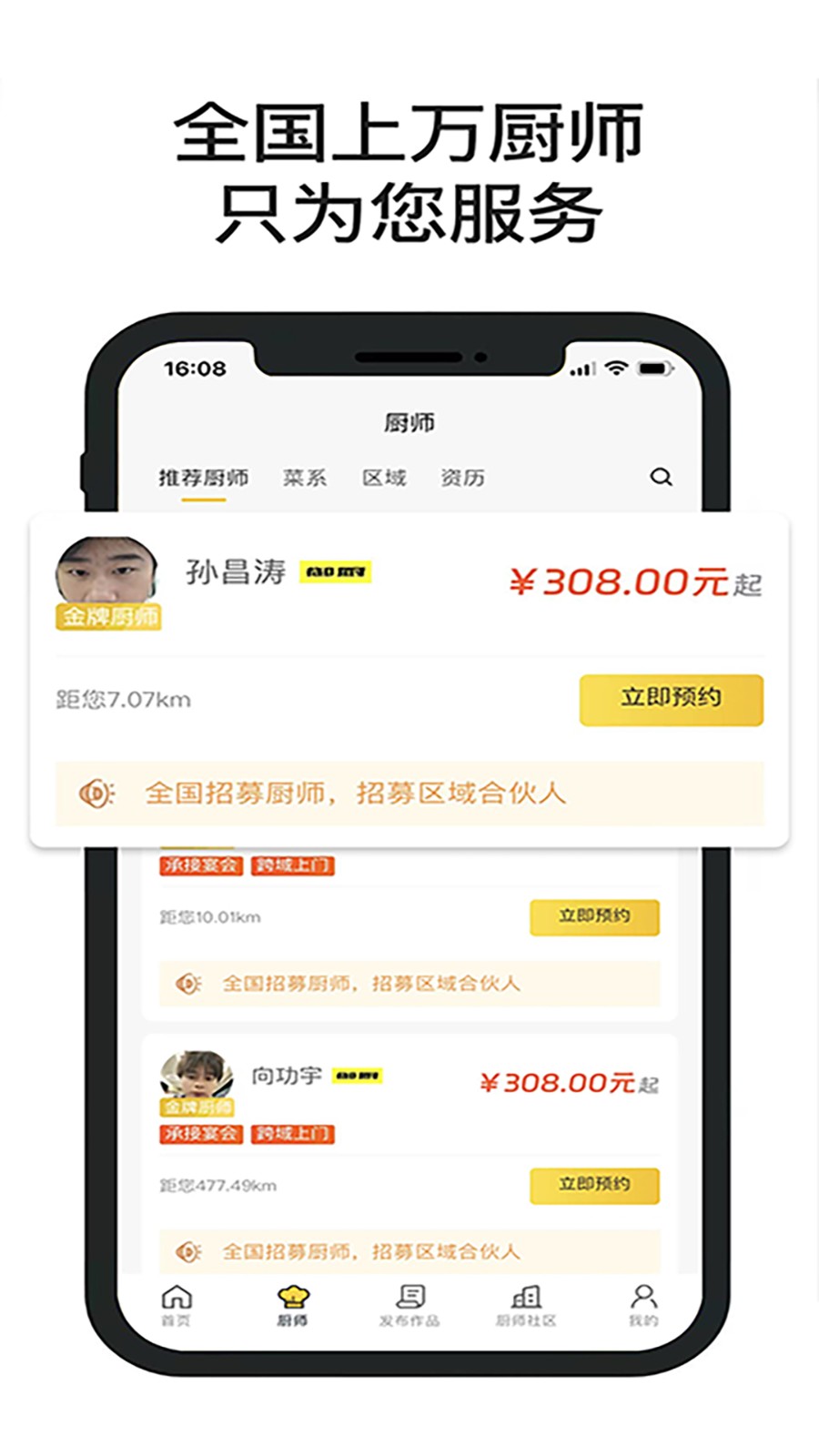 通过输入厨师的名字,用户可以使用搜索功能快速找到并预约心仪的专业厨师。