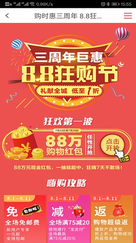 购时惠是一款能快速提供多种购物体验的手机购物类软件,购时惠软件里面为用户整合了海量的特惠信息,每天都会和不同的品牌方合作带给用户惊喜,会对不同的主题做一个特惠专场,里面的特惠活动非常多,方便用户轻松进行使用。