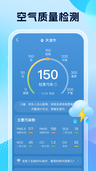 关注每一次呼吸的清新与否,空气质量实时报告关照您的健康,全面监测PM2.5、PM10等指标,让您及家人沐浴更健康的空气。