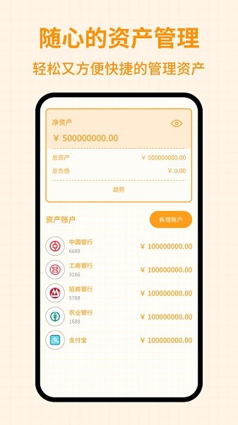 现金、储蓄卡、工资卡、信用卡、理财、基金轻松管理,让每笔收入和支出都明明白白。