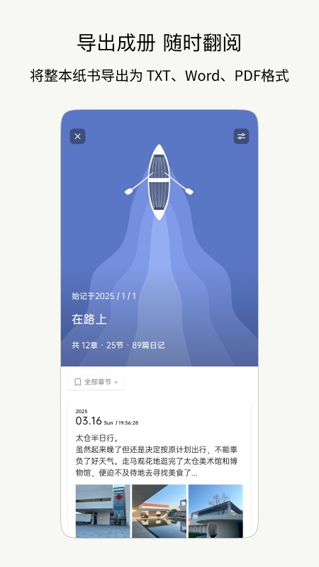 把生活写成一本书,将日记收录进不同的纸书/章/节,支持整本纸书导出,方便打印成册。