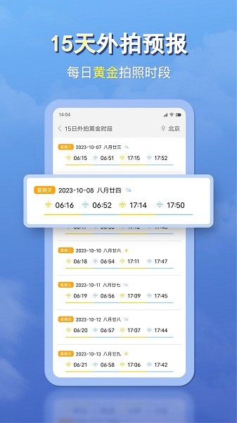 支持查询15天所在城市每天户外拍照黄金时段。帮您捕捉到一天中只会短暂出现的美好画面。户外摄影和旅游爱好者不要错过呦。