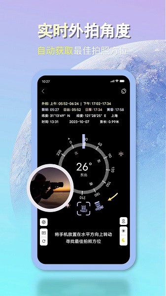 总是困惑哪里是合适的拍照方位?外拍指南针会根据您所在位置实时找出较好的拍照方位。转一转手机便可自动获取,简单好用。支持自动定位。